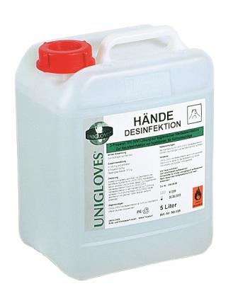 Hände und Unterarme mit der Lösung eingerieben und 5 Minuten lang feucht gehalten.