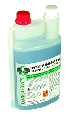 UNIGLOVES Instrumenten-Desinfektion Forte Plus ist ein hochwirksames Instrumentendesinfektionsmittel für den dentalmedizinischen Bereich. Geeignet für ärztliches Instrumentarium, Laborgeräte aus Glas, Porzellan, Metall, Gummi, Kunststoff, usw.